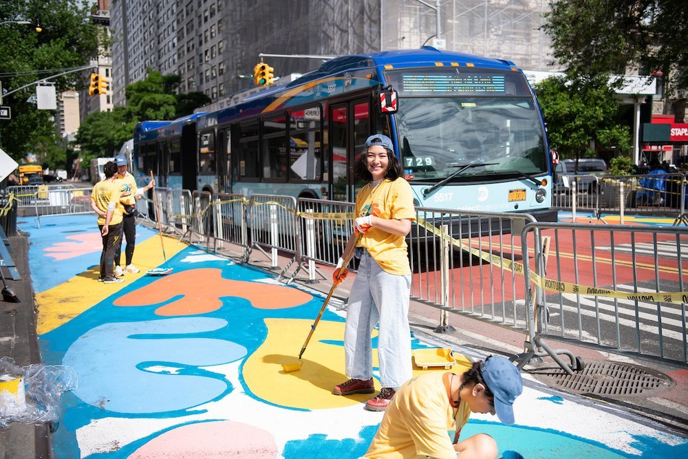 Union Square Partnership (USP) today announces the completion of a new street mural installation along the pedestrian areas of the 14th Street Busway, between Broadway and University Place. Titled “Flowing Together,” the colorful artwork is designed by Queens-based visual artist Talisa Almonte. The 7,500-square-foot mural has been installed from Monday, May 13 through Friday, May 17 with the help of community partners, volunteers and sponsors. This is USP’s fourth annual street mural, presented in partnership with the New York City Department of Transportation Art (NYC DOT Art) program and supported by Street Plans, a Brooklyn-based urban planning and design firm with national and local expertise in delivering asphalt art projects that enliven streets and public spaces.